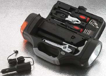 You will find this Maxam� Dual Light and Tool Kit handy in your car boat home office or while camping. Features combination lights and tool kit in one handy carrying case, Hazard Light that blinks, DC jack, safety reflectors, and swivel light. Tool set includes hammer, 2 screwdrivers, adjustable wrench, pliers, and Allen/hex keys set. Measures 14 1 2'' long. Lifetime warranty.